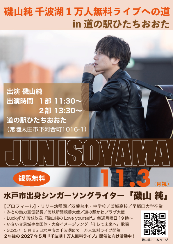 Live 2025.11.03 磯山純 千波湖1万人無料ライブへの道 in 道の駅ひたちおおた 2025.11.3(月祝) 会場 道の駅ひたちおおた 住所 常陸太田市下河合町1016-1 出演 磯山純(AG,Vo) 出演時間 11:30〜、13:30〜 観覧無料 BACK