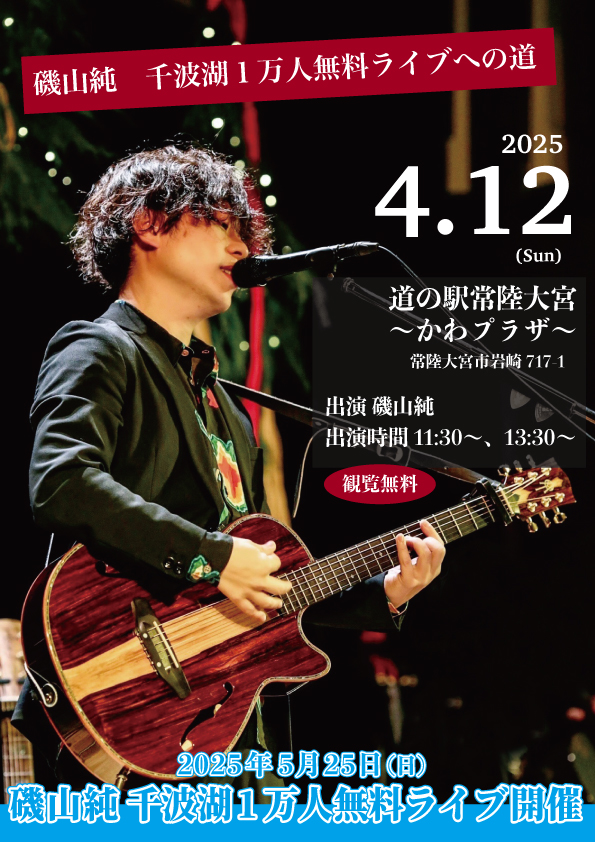 Live 2025.04.12 【中止】磯山純 千波湖1万人無料ライブへの道 in 道の駅常陸大宮かわプラザ 2025.4.12(土) ※中止となりました 会場 道の駅常陸大宮〜かわプラザ〜(多目的室) 住所 常陸大宮市岩崎717-1 出演 磯山純 出演時間 11:30〜、13:30~ 観覧無料 BACK