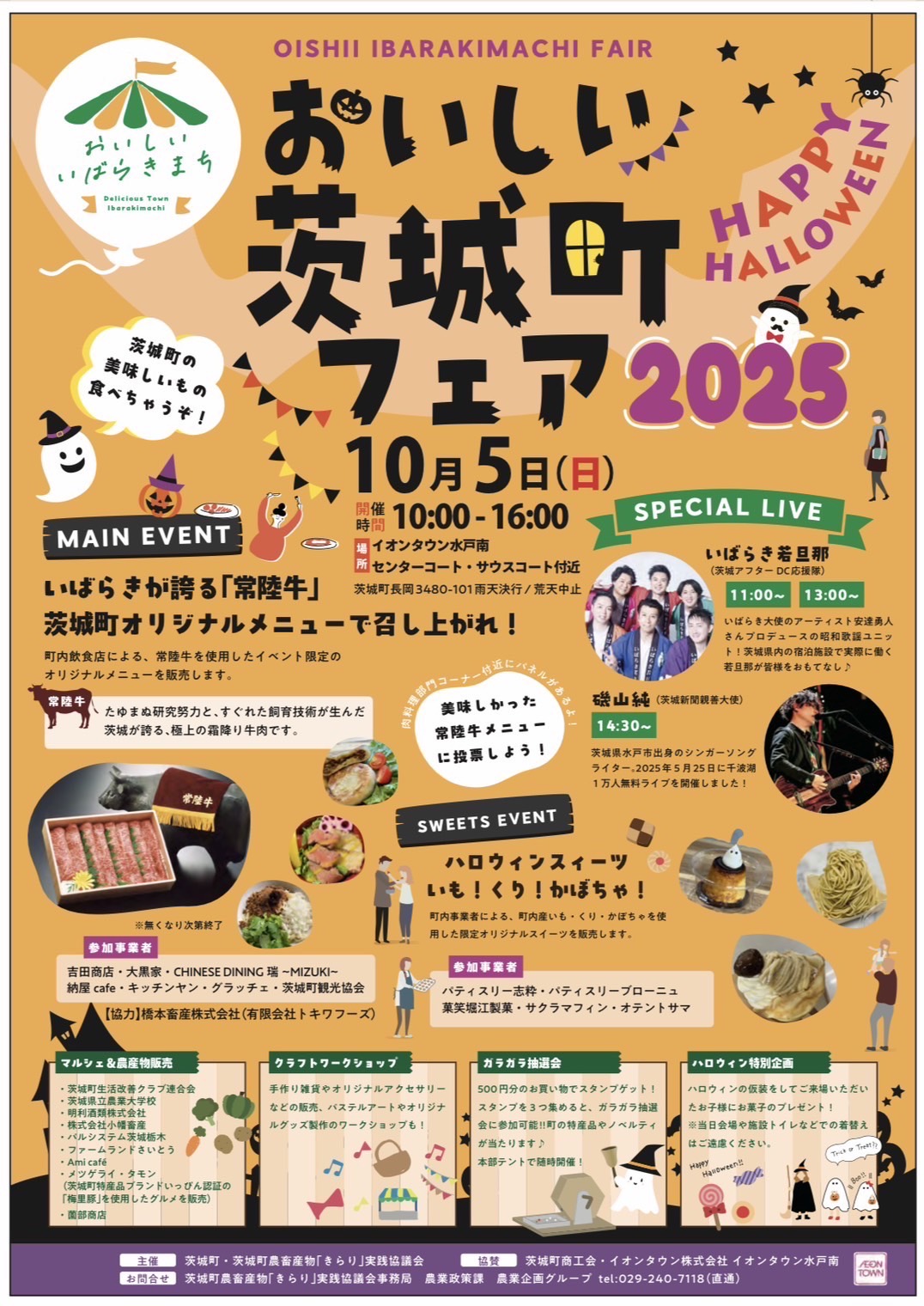 Live 2025.10.05 おいしい茨城町フェア2025 2025.10.5(日) 会場 イオンタウン水戸南 センターコート 住所 東茨城郡茨城町長岡3480ー101 出演時間 14:30~ 観覧無料 BACK