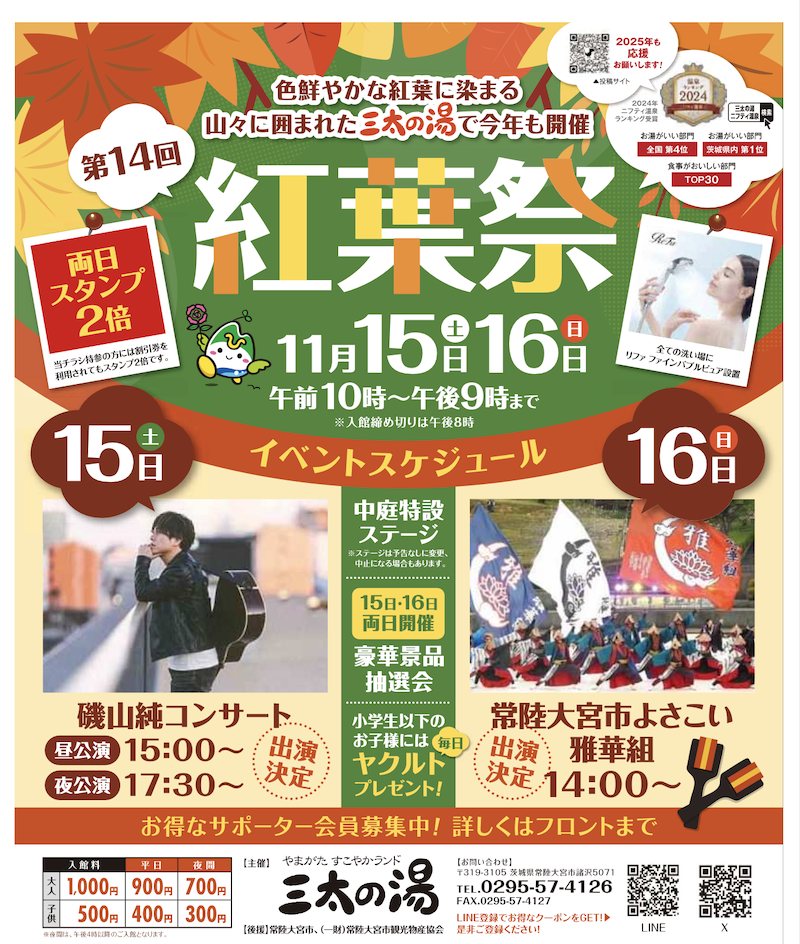 Live 2025.11.15 第14回紅葉祭 in 常陸大宮(三太の湯) 2025.11.15(土) 会場 三太の湯 住所 常陸大宮市諸沢5071-1 出演時間 15:00〜、17:30~ 観覧無料 BACK