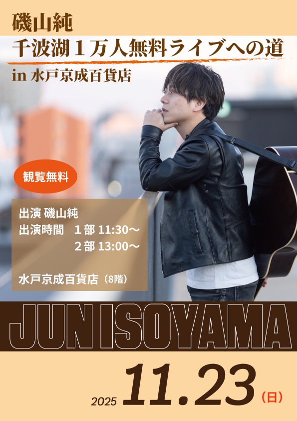 Live 2025.11.23 磯山純 千波湖1万人ライブへの道 in 水戸京成百貨店 2025.11.23(日祝) 会場 水戸京成百貨店 住所 水戸市泉町1-6-1 8F 出演 磯山純 出演時間 11:30〜/13:00〜 観覧無料 BACK