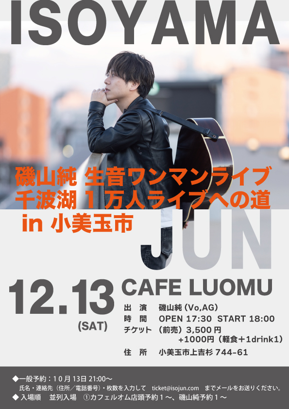 予約 氏名・連絡先(住所/電話番号)・枚数を入力して ticket@isojun.com までメールをお送りください。