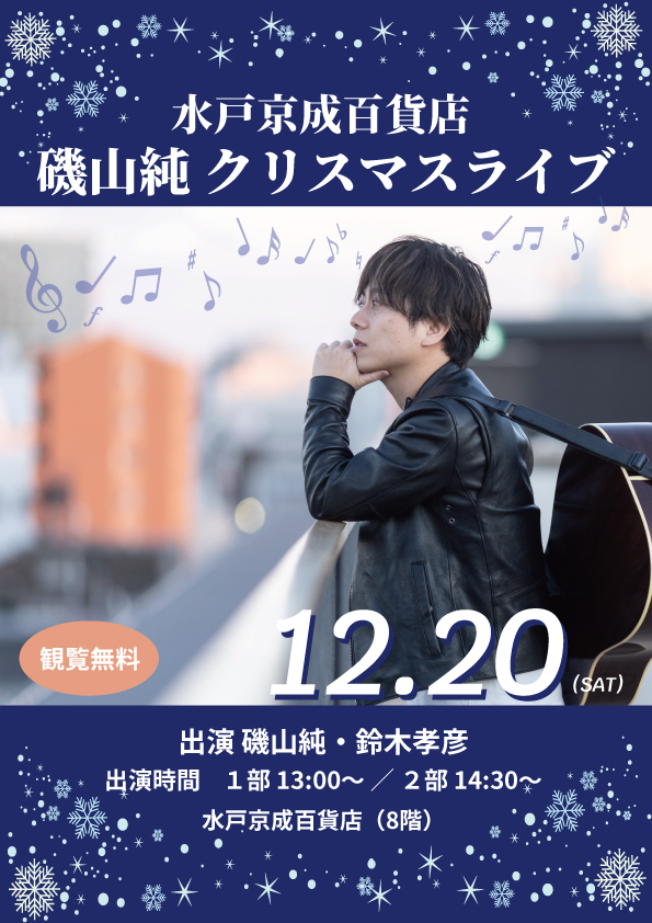 Live 2025.12.20 水戸京成百貨店 磯山純 クリスマスライブ 2025.12.20(土) 会場 水戸京成百貨店 住所 水戸市泉町1-6-1 8F 出演 磯山純(Vo,AG) 鈴木孝彦(Key,Cho) 出演時間 13:00〜/14:30〜 観覧無料 BACK