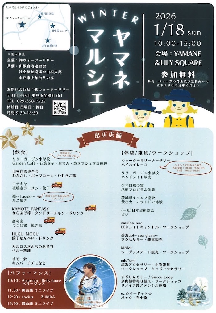 Live 2026.01.18 WINTER ヤマネマルシェ 2026.1.18(日) 会場 YAMANE&LILY SQUARE 住所 水戸市全隈町261 磯山純 出演時間(予定)11:30〜、13:30〜 観覧無料 BACK