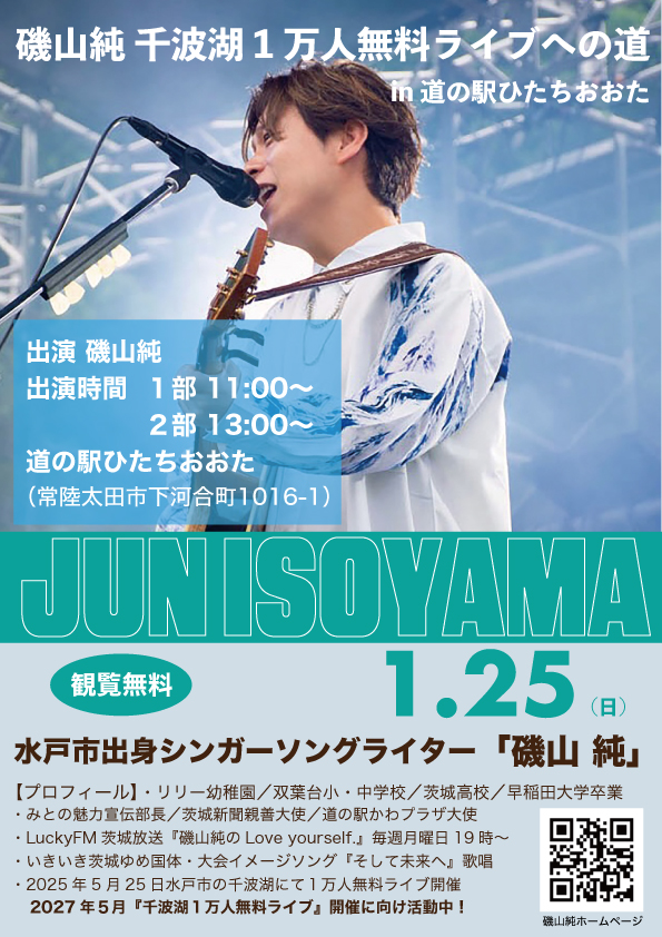Live 2026.01.25 磯山純 千波湖1万人無料ライブへの道 in 道の駅ひたちおおた 2026.1.25(日) 会場 道の駅ひたちおおた 住所 常陸太田市下河合町1016-1 出演 磯山純(AG,Vo) 出演時間 11:00〜、13:00〜 観覧無料 BACK