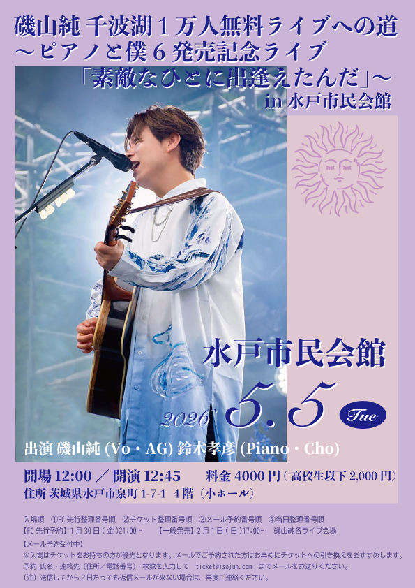【一般発売】2月1日(日)17:00〜 磯山純各ライブ会場、メール