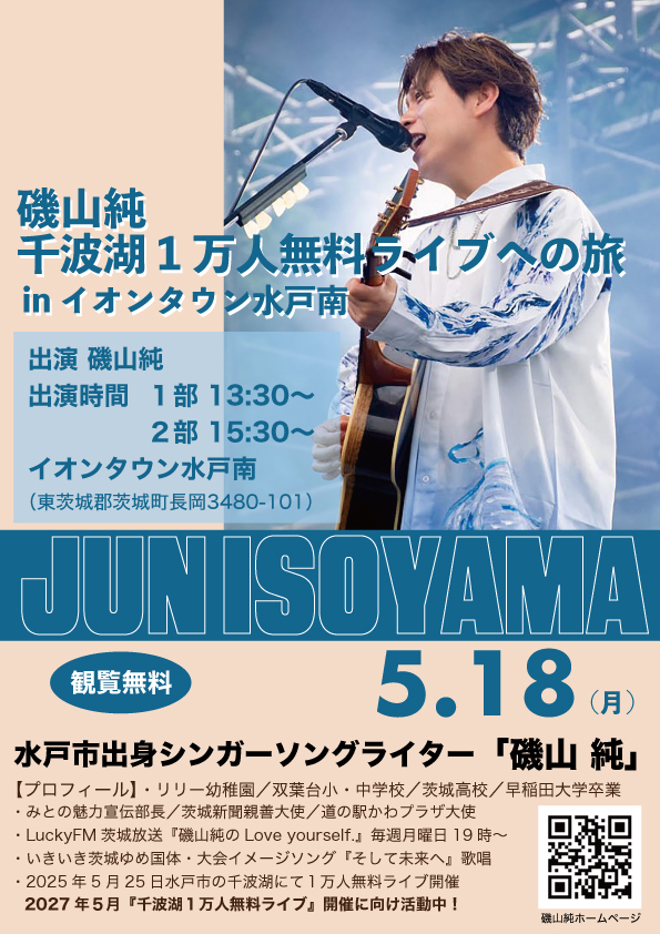 Live 2026.05.18 千波湖1万人無料ライブへの道 in イオンタウン水戸南 2026.5.18(月) 会場 イオンタウン水戸南 センターコート 住所 東茨城郡茨城町長岡3480ー101 出演時間 13:30〜/15:30〜 観覧無料 BACK